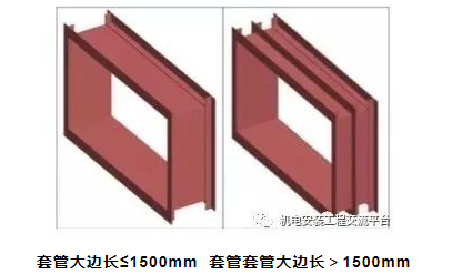1.套管采用厚度δ≥1.6mm的铁皮焊接制作,两端安装角钢法兰式加固 框,风管与加固框翻遍铆接或焊接均可;如果边长大于等于 1500mm,则应在套管 中间再安装角钢加固框进行加固。以防止套管边向内凸。
